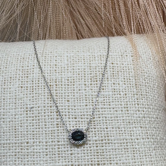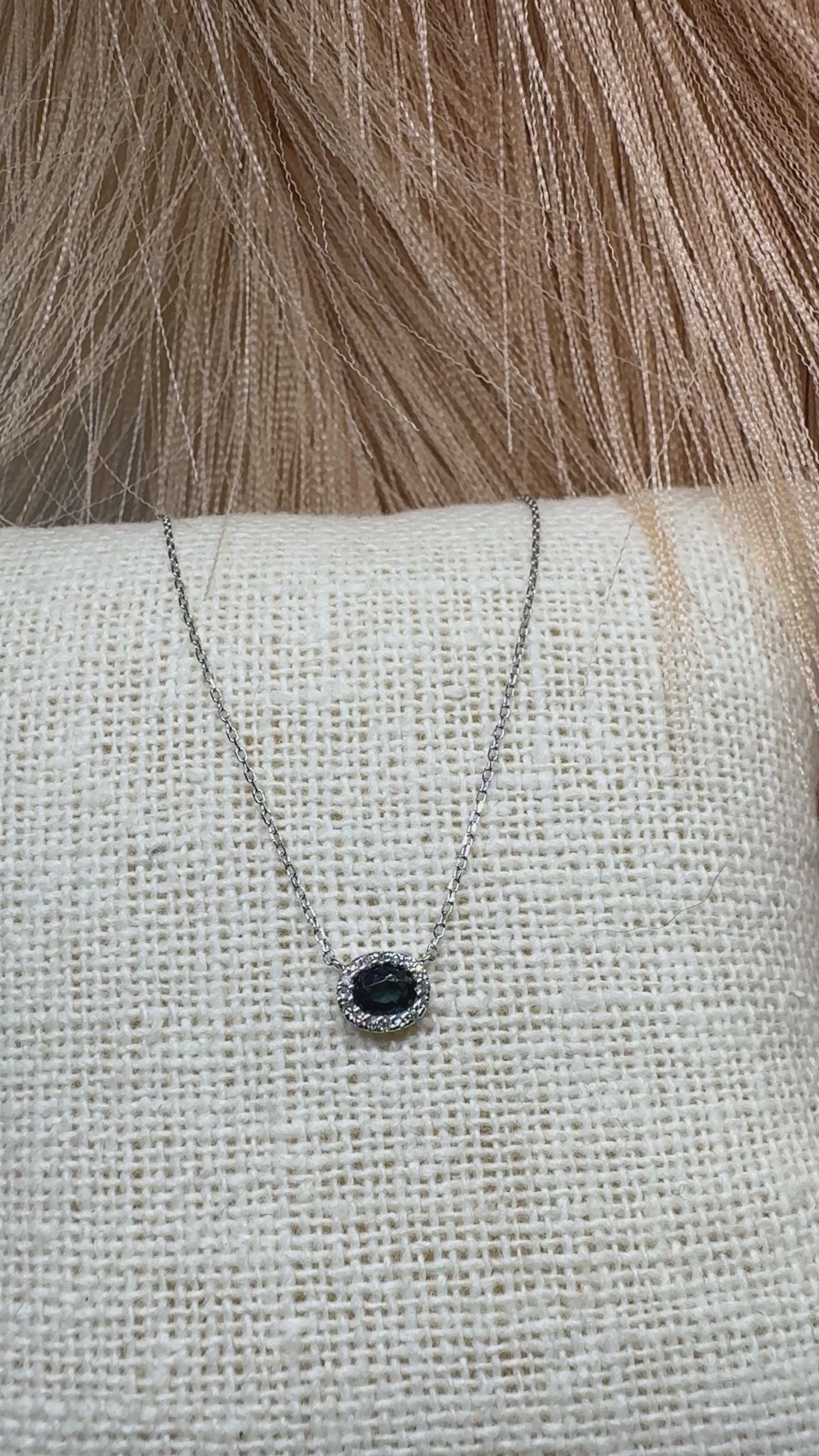 14K White Gold Oval Sapphire & 0.10ctw Diamond Halo Necklace